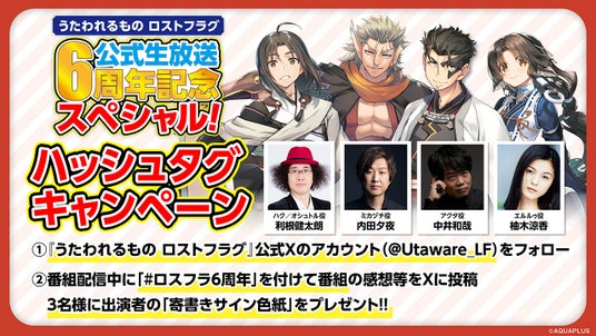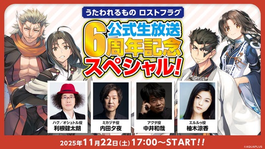 YouTubeのアクアプラス公式チャンネルにて、2025年11月に6周年を迎える『うたわれるもの ロストフラグ』を記念した公式生放送番組を配信いたします。豪華な出演者の方々による楽しいトークや最新情報等をお届けいたします。