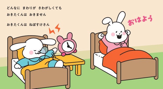 関西の朝の顔といえば、『おはよう朝日です』に登場する番組公式キャラクターの「おきたくん」と「めざめちゃん」。おきたくんはちょっぴりドジだけど、なんでもチャレンジするお兄ちゃんうさぎ。めざめちゃんはしっかりもので、ちょっぴりおせっかいな妹うさぎ。そんなふたりが朝起きてから、保育園・幼稚園・小学校に行くまでのルーティンが絵本になりました。
