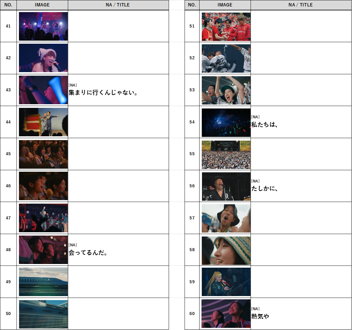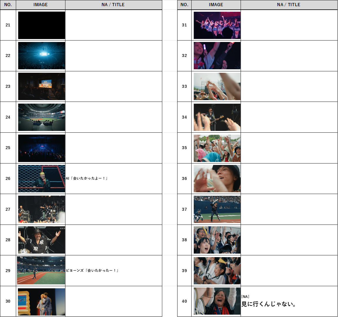 本CMには、歌手の「AI」さんや「MONGOL800」、プロ野球チーム「オリックス・バファローズ」、プロサッカーチーム「名古屋グランパス」、お笑いコンビ「ナイチンゲールダンス」、アイドルグループ「BEYOOOOONDS」の総勢6組が登場。それぞれのファンがライブや試合、舞台に「会いにいく」までの道のりを描き、そして会場で「人と人が会う瞬間」を実際のライブ・試合で撮影しました。「会いたかったよ」「また会いましょう」ライブで伝えられる彼ら彼女らの言葉は、次の日からの日々をがんばる原動力となります。