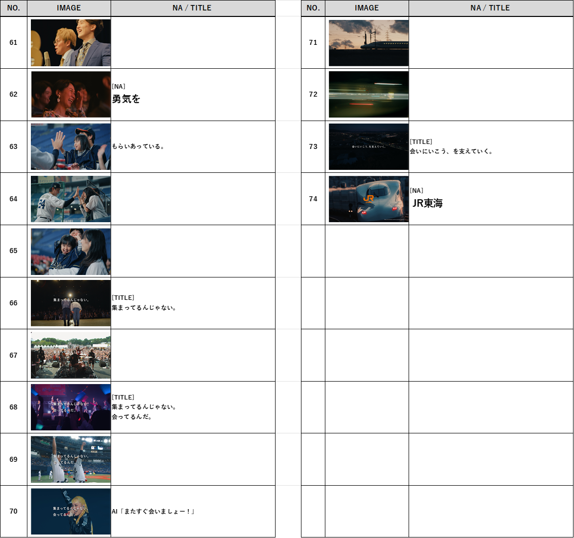 東海旅客鉄道株式会社(以下、JR東海)は、車内チャイムでもある楽曲「会いにいこう」を中心に、2023年より「会いにいこう」キャンペーンを展開してまいりました。2025年のコンセプトは「集まってるんじゃない。会ってるんだ。」です。ライブやスポーツ観戦時の、人と人が「会う」瞬間。「観客席に立つ人」と「ステージ・グラウンドに立つ人」との間に生まれる熱量や一体感を、実際の会場で撮影し、新TVCM『集まってるんじゃない。』篇を制作しました。本CMは2025年11月15日(土)より放映し、同日夜の『ラグザス 侍ジャパンシリーズ2025』内で60秒長尺バージョンをお送りします。