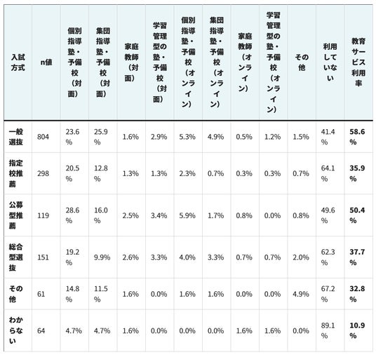 一方で、入試方式別に結果を見ると、様相は大きく異なります。学力試験が合否の鍵を握る「一般選抜」で受験した層では、「塾・予備校・家庭教師を利用していない」という回答は41.4%に留まり、約6割の生徒が何らかの教育サービスを利用していることがわかりました。