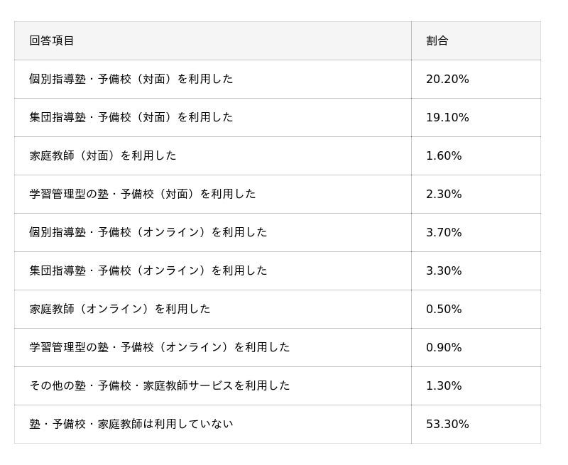 特に「集団指導塾・予備校(対面)」(25.9%)や「個別指導塾・予備校(対面)」(23.6%)の利用率が高く、学力向上や受験情報の入手において、従来型の塾・予備校が依然として重要な役割を担っていることがうかがえます。厳しい競争を勝ち抜くためには、プロの指導が不可欠と考える家庭が多いようです。