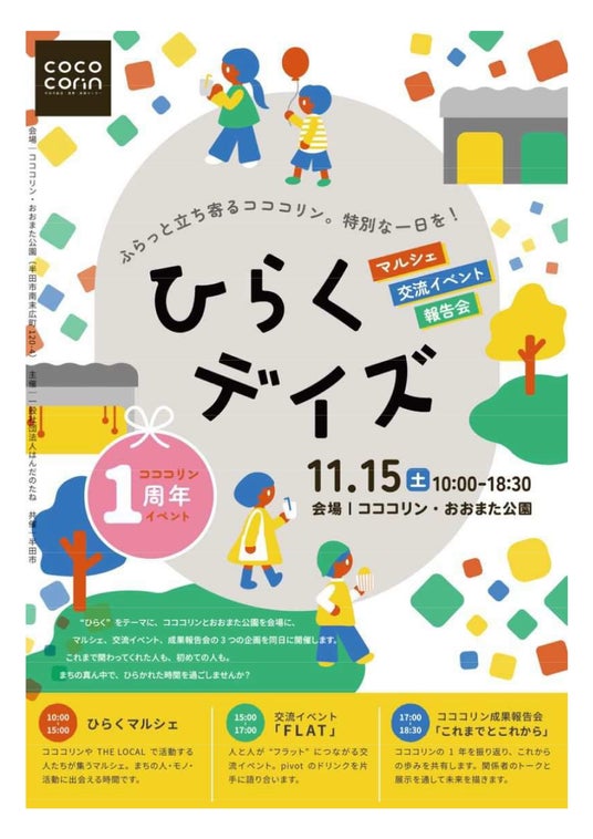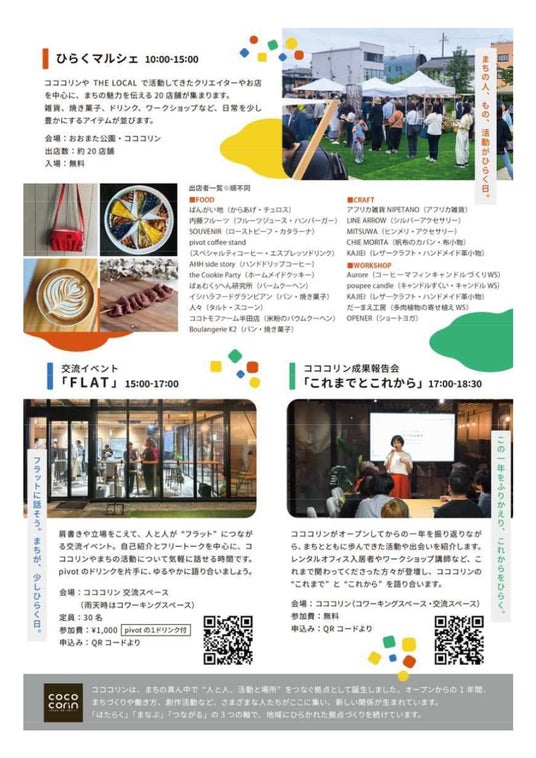 ”ひらく”をテーマに、コココリンとおおまた公園を会場に、マルシェや交流イベント、成果報告会を行います。