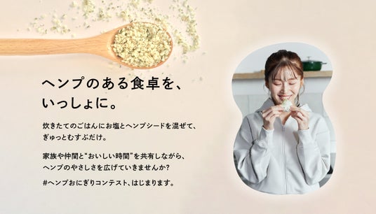 株式会社ヘンプフーズジャパン(本社:栃木県那須塩原市、代表取締役:松丸誠)は、植物性たんぱく質・オメガ3などを豊富に含むヘンプシードをもっと身近に感じていただきたいという想いから、日々のごはんにひとさじ混ぜるだけで完成する「ヘンプおにぎり」をテーマにした『ヘンプおにぎりコンテスト』を2025年11月16日より開催いたします。ご家庭にある食材で気軽に楽しめる“ヘンプのある食卓”を、全国の皆さまと一緒に広げていきます。