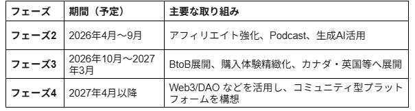フェーズ2以降では、Podcast 配信や BtoB 展開を通じて収益源の多様化を図り、北米市場での拡大を見据えた新たな事業の柱として成長を目指します。