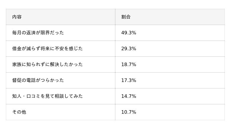 ・債務整理を依頼したきっかけとして最も多かったのは「毎月の返済が限界だった」(49.3%)。次いで「借金が減らず将来に不安を感じた」(29.3%)、「家族に知られずに解決したかった」(18.7%)が続いた。
