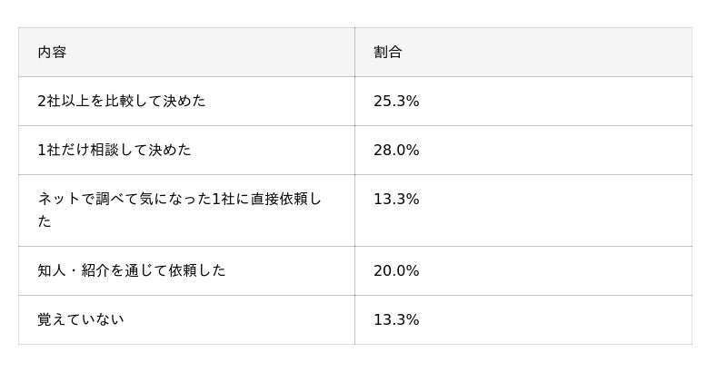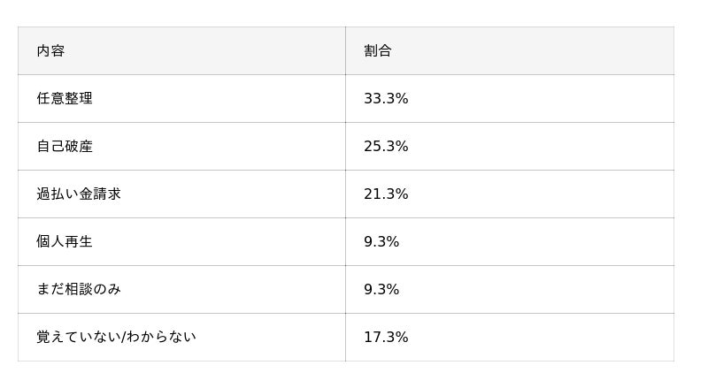・債務整理の方法では「任意整理」(33.3%)が最多で、次いで「自己破産」(25.3%)、「過払い金請求」(21.3%)が多く選ばれた。また、2社以上を比較して依頼を決めた人は25.3%と、複数事務所を比較する傾向も見られた。