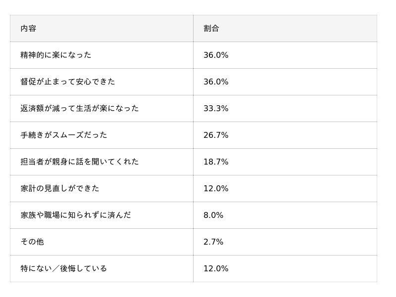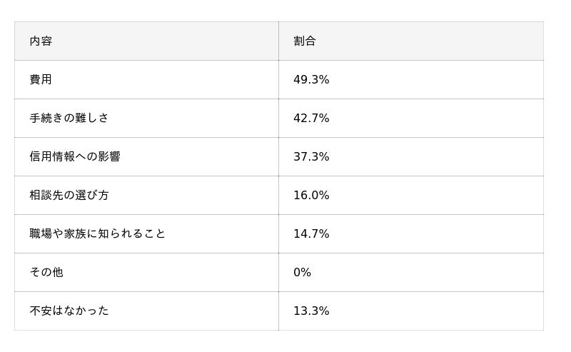 ・債務整理を行って「精神的に楽になった」「督促が止まって安心できた」と感じた人がそれぞれ36.0%。一方で、相談前は「費用」(49.3%)や「手続きの難しさ」(42.7%)に不安を抱いていたという回答が多かった。
