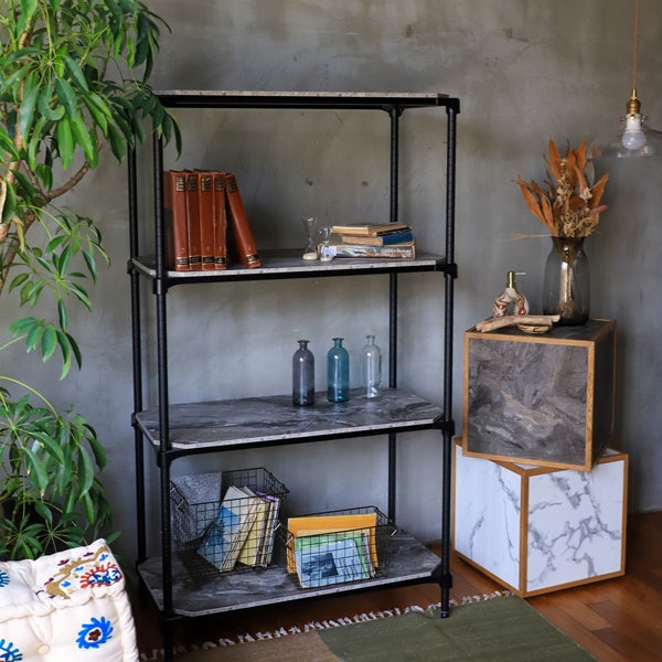 ストーン柄の天板にアルミフレームでシャープな印象が際立つシェルフ。アンティークとモダンが融合し、海外の邸宅やホテルのような空間を引き立たせます。