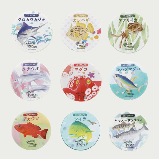 利用用途が多岐にわたる便利なYOJOTAPEは「アカジン」「アオリイカ」「カワハギ」「キハダマグロ」「クロカワカジキ」「マダコ」「シイラ」「タチウオ」「ヤマメ~サクラマス」の9種類!
