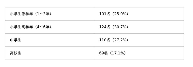 回答者の年齢層は「小学生高学年(4~6年)」が124名(30.7%)で最多、次いで「中学生」110名(27.2%)、「小学生低学年(1~3年)」101名(25.0%)、「高校生」69名(17.1%)となっています。