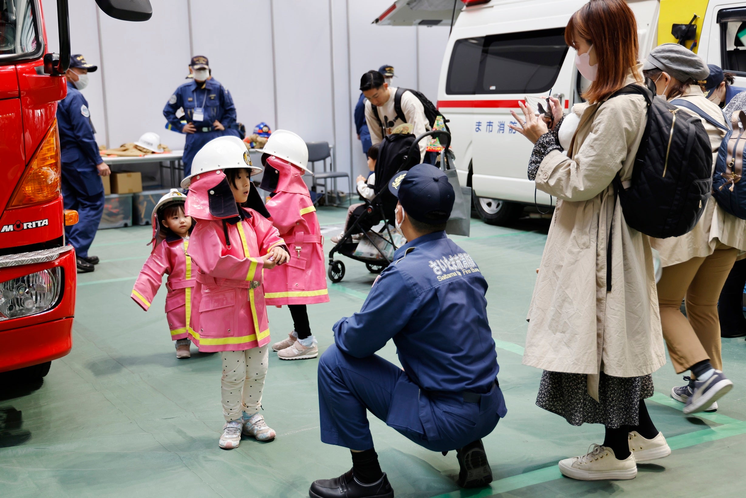 防火服を着て、憧れの消防車の前でパシャリ!