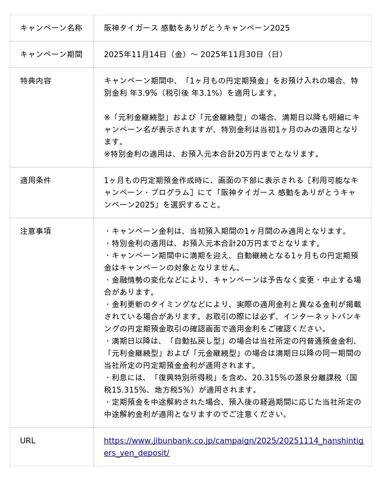 「年3.9%(税引後 年3.1%)」の特別金利は、2025年シーズンを通じて阪神タイガースが届けてくれた数々の熱戦と感動に対して “サンキュー” の気持ちを込めたものです。また、お預け入れの上限金額については、2025年9月に実施をした「阪神タイガース リーグ優勝キャンペーン2025」が開始から2週間で預入額が100億円を突破し、大変ご好評いただいたことから、本キャンペーンでは上限金額を前回の10万円から2倍の20万円に引き上げています。この機会にぜひご利用ください。