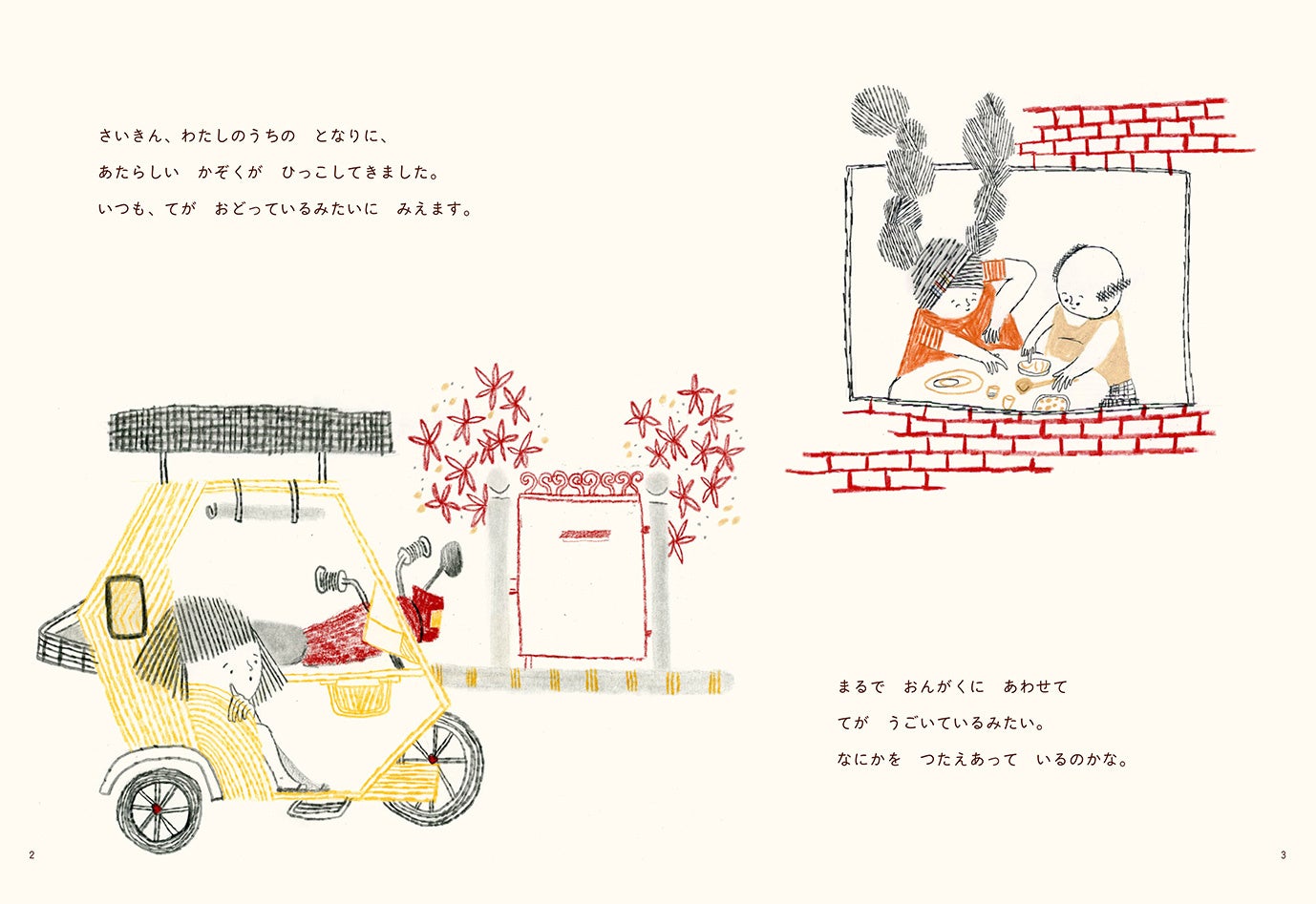 さいきん、わたしのうちのとなりに、あたらしいかぞくがひっこしてきました。いつも、てがおどっているみたいにみえます。なにをしているのかな?
