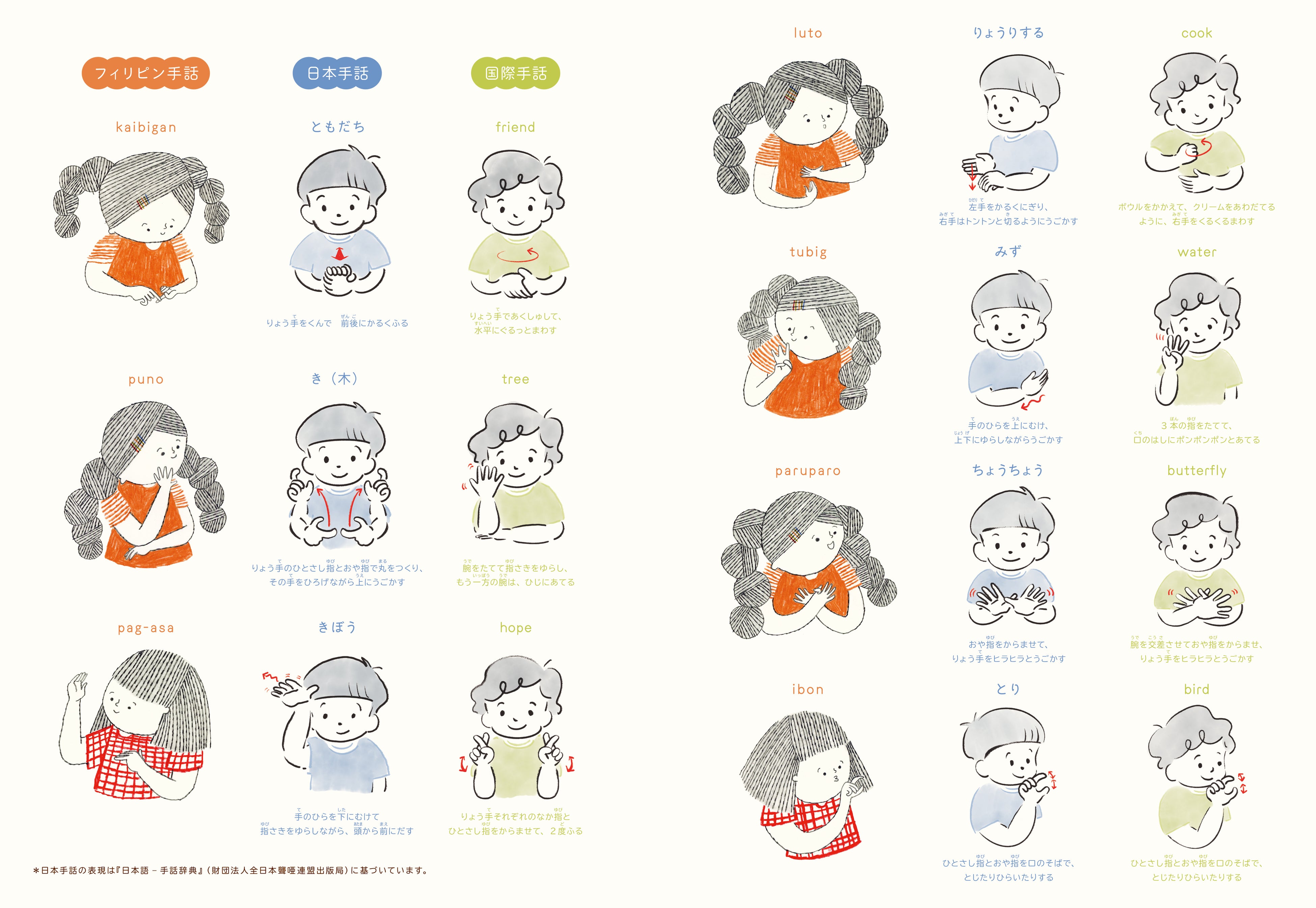 女の子ふたりの、手話を介したほほえましいやりとりを通じて、手話でのコミュニケーションに触れることができる絵本。巻末には原書掲載のフィリピン手話に加え、日本版オリジナルで、日本手話、国際手話も加えた、手話の紹介ページも収録しており、絵本を読んだあとに、手話を実践することもできます。