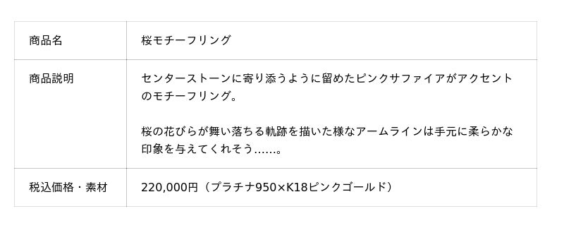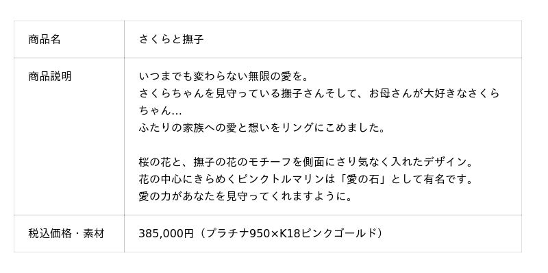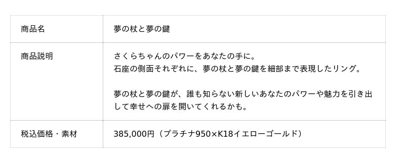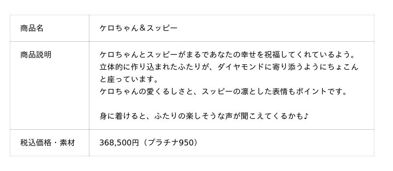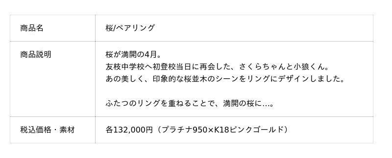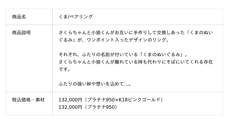 婚約指輪は「夢の杖と夢の鍵」「さくらと撫子」「ケロちゃん&スッピー」「桜モチーフリング」の4種類。結婚指輪は「桜/ペアリング」「くま/ペアリング」の4種類。