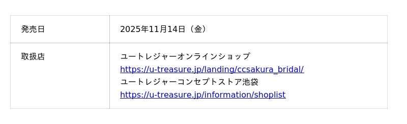 株式会社ユートレジャー(本社:東京都新宿区、代表取締役社長:青木 興一、株式会社ケイ・ウノの連結子会社)は、TVアニメ「カードキャプターさくら」とのコラボレーションブライダルリング(婚約指輪・結婚指輪)を2025年11月14日(金)より再販売いたします。