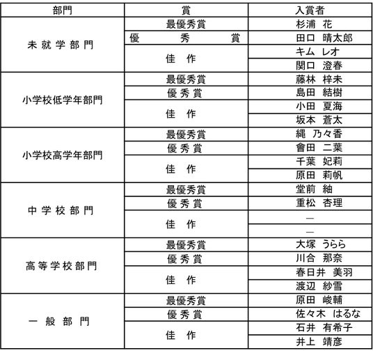 【募集部門】 未就学部門、小学校低学年部門、小学校高学年部門、中学校部門、高等学校部門、一般部門