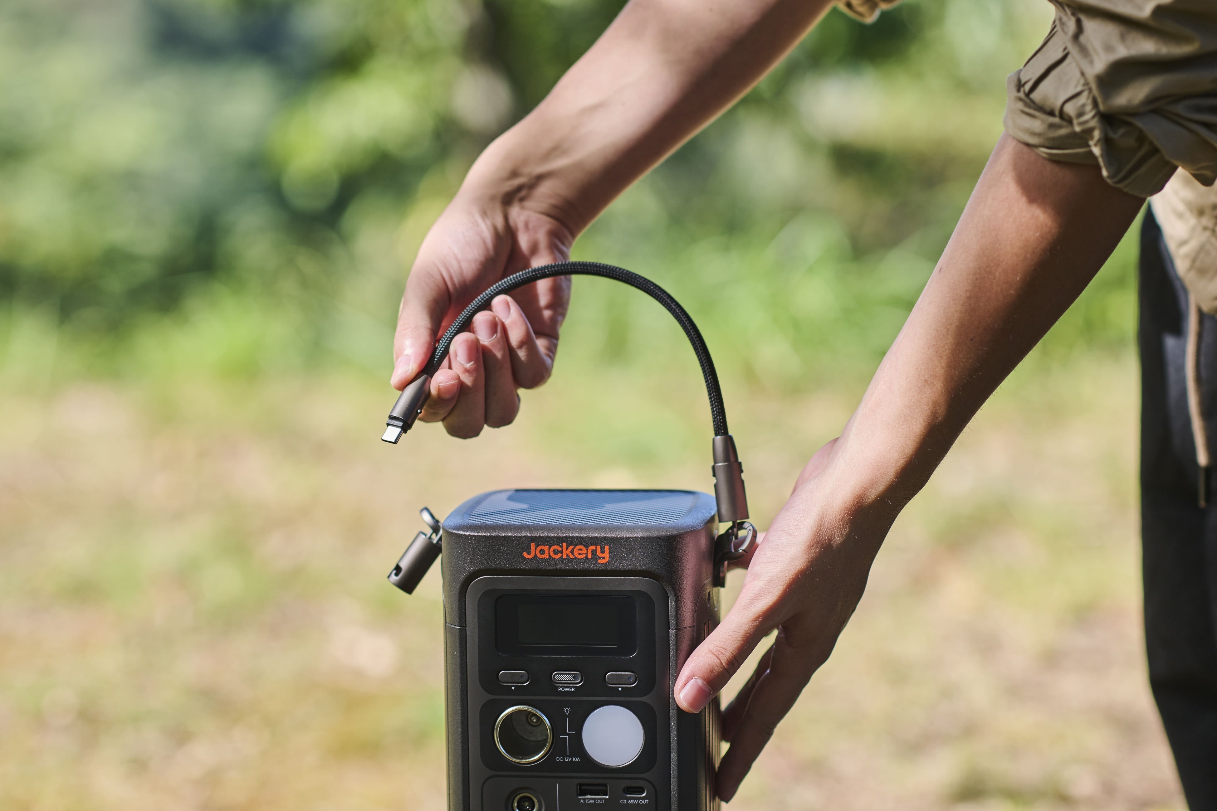 「Jackery ポータブル電源 300D」はモバイルバッテリー9台分に相当する288Whの大容量で、USB-Aポート1基(15W)と、USB Type-C(USB-C)ポート3基(140W×2、65W×1)を搭載。さらにDC出力(120W)にも対応し、合計5ポートで最大300Wの出力に対応しています。スマートフォンからノートPC、車載冷蔵庫まで幅広く同時に給電できます。付属のUSBケーブルハンドストラップは、持ち運び用のストラップとしても、充電ケーブルとしても使える2in1仕様。充電ケーブルとして使用時は、最大140Wの高出力。お使いのスマートフォンやタブレット端末、ノートPC等のUSB-Cポート搭載機器へ充電が可能です。