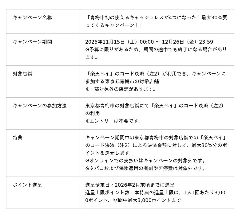 本キャンペーンでは、東京都青梅市の対象店舗(注1)において、キャンペーン期間中に「楽天ペイ」のコード決済(注2)を利用した方を対象に、決済金額に対して最大30%分の「楽天ポイント」を還元(注3)します。