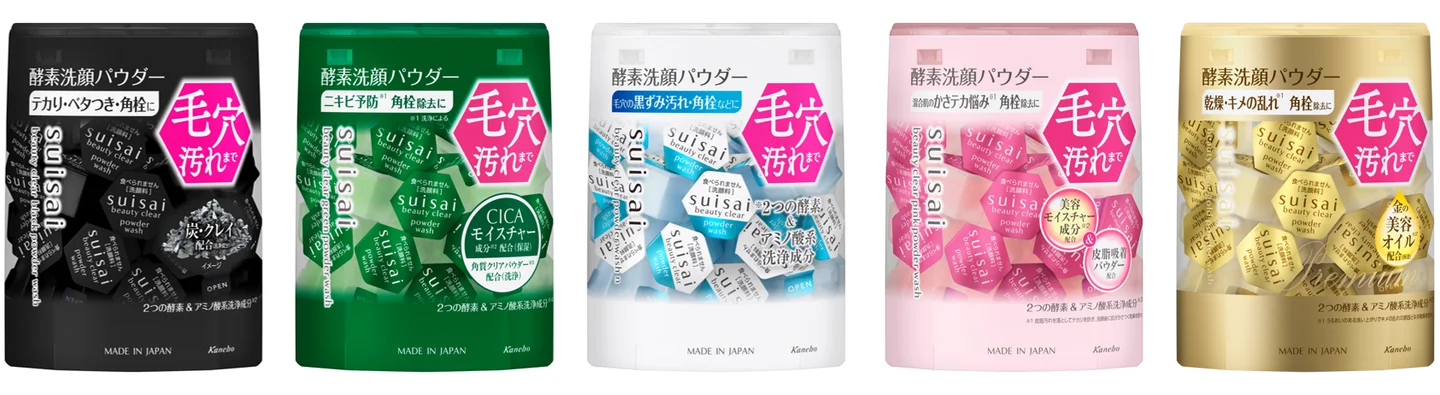 「suisai(スイサイ)」は、今年誕生20周年を迎えるカネボウ化粧品の洗顔専門ブランドです。ブランドを代表する酵素*¹洗顔料「パウダーウォッシュ」シリーズをはじめ、毛穴汚れ悩みに対応する商品を多数ラインナップしており、毛穴ケア洗顔料(セルフ+カウンセリング品)市場において売上No.1*²を獲得しています。