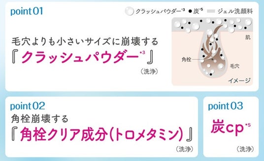 洗浄成分「クラッシュパウダー」*³「角栓クリア成分(トロメタミン)」*⁴「炭cp」*⁵を配合した密着ジェルが、居座る角栓・黒ずみなどの汚れを崩壊しながら掻き出してすっきりオフします。