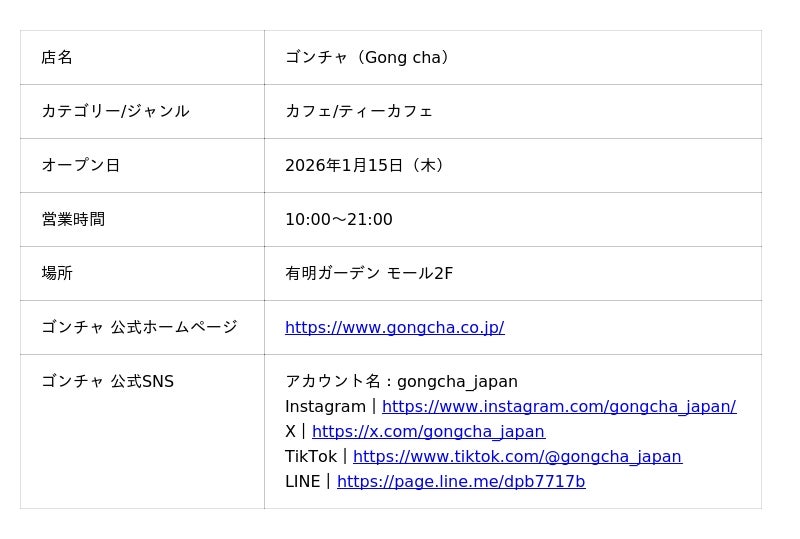 住友不動産商業マネジメント株式会社(本社:東京都新宿区 代表取締役社長:山本 直人)が運営する商業施設「住友不動産 ショッピングシティ 有明ガーデン」(所在:東京都江東区)に、このたび新たなカフェ『ゴンチャ(Gong cha)』がオープンすることとなりました。