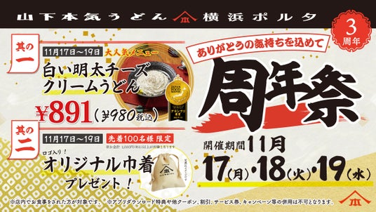 株式会社ガーデン(本社:東京都新宿区 代表取締役社長:川島賢 以下「当社」) が運営する、「山下本気うどん横浜ポルタ」は、2025年11月18日(火)にオープン3周年を迎えます。ご愛顧くださるお客様への感謝の気持ちを込めて、「山下本気うどん 横浜ポルタ」にご来店いただいたお客様を対象とした「周年祭」を2025年11月17日(月)~19日(水)の3日間限定で開催いたします。