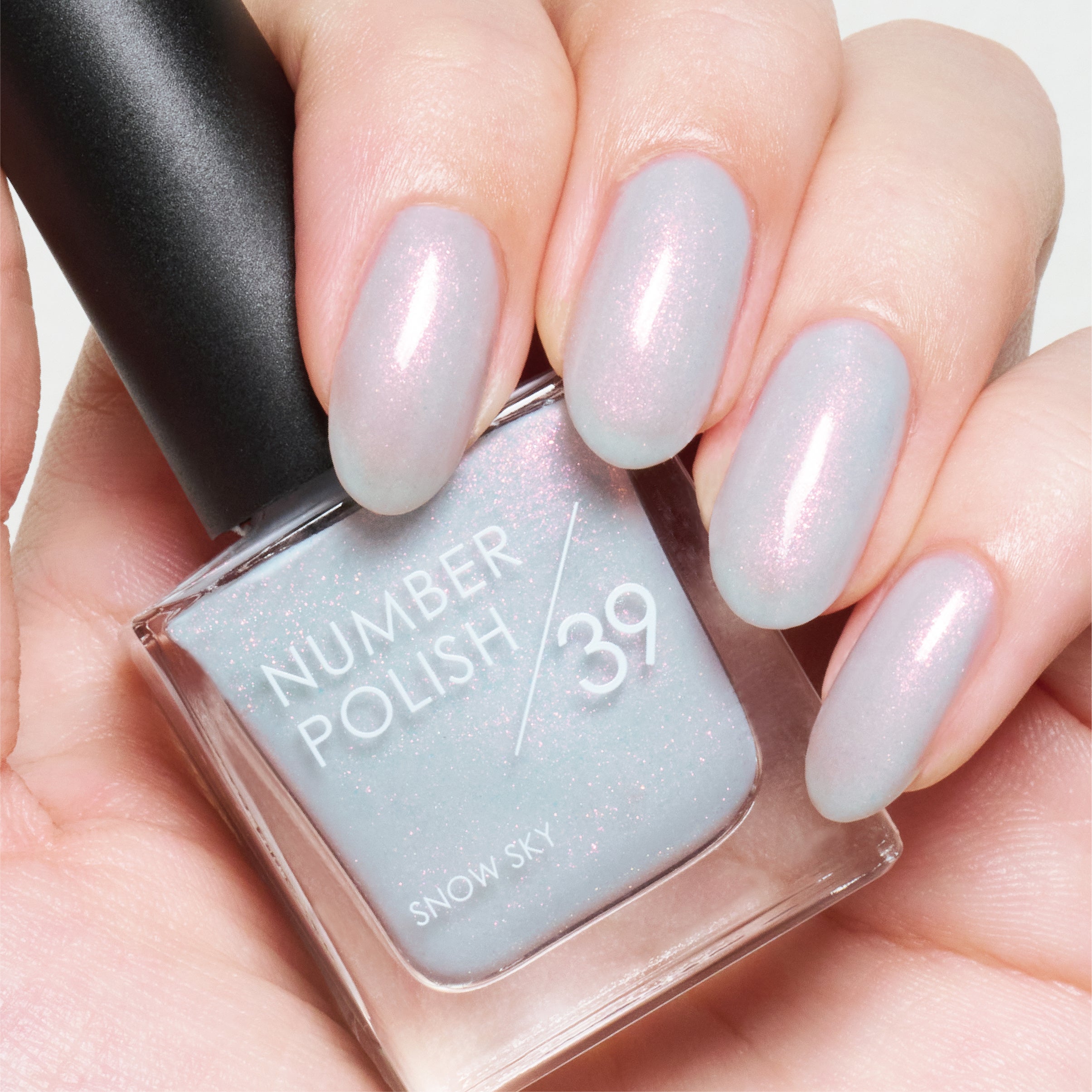 雲間から指す光のようにピンクの偏光ラメがきらめく雪空を思わせるアイシーブルー。