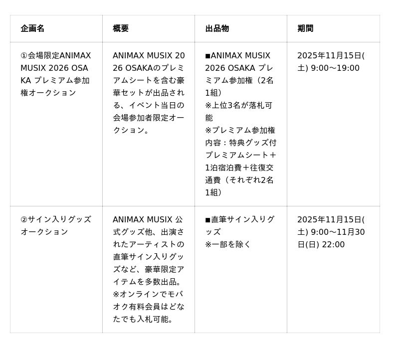 株式会社アニマックスブロードキャスト・ジャパン(本社:東京都渋谷区、代表取締役社長:滝山 正夫)と、株式会社NTTドコモ(本社:東京都千代田区、代表取締役社長:前田 義晃)が主催する【東武鉄道 presents ANIMAX MUSIX 2025 YOKOHAMA supported by Lemino】(2025年11月15日開催)と連動し、株式会社モバオク(本社:東京都渋谷区、代表取締役社長:小一原 宏樹、以下モバオク)が運営するオークションサービス「モバオク」にて、若手クリエイター支援を目的としたチャリティーオークションを2025年11月15日(土)より開催いたします。