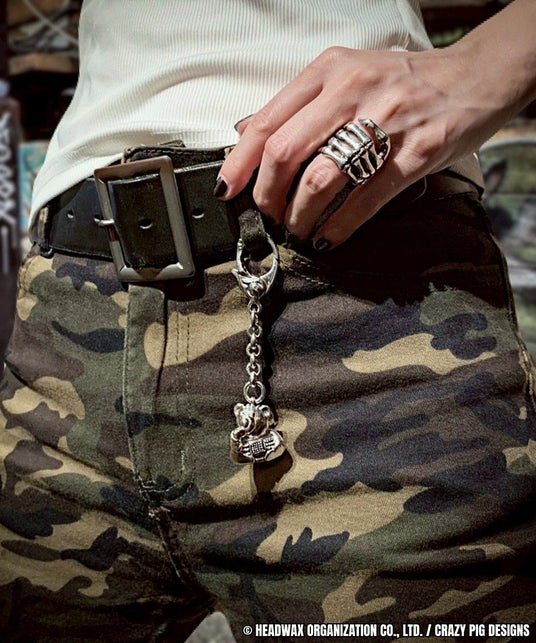 カラビナは、サイコベアをより日常に身近に感じられる解決策として新たにデザインされました。hideが愛用したCRAZY PIG DESIGNSの代表作『ボーンハンドリング』のオマージュとして骨の手の装飾が施され、hideとCRAZY PIG DESIGNSとの絆を象徴します。