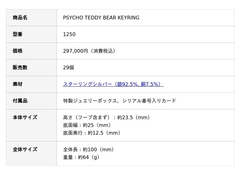 hideがデザインした「PSYCHO TEDDY BEAR(通称サイコベア)」を29個限定生産のシルバー製キーリングとして製作、2025年11月21日より販売開始