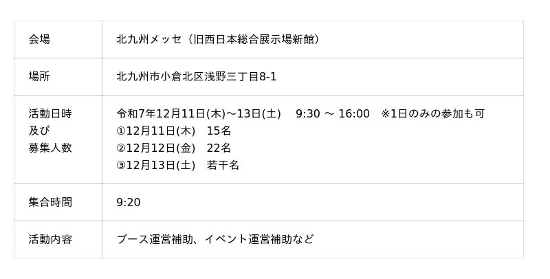本イベントにおけるボランティア募集の目的は、大学や専門学校等に在籍している学生が、出展団体ブースの運営の一部に関わることにより、本イベントや出展団体を深く知っていただくことです。キャリア教育やイベント運営に興味がある方、子どもが好きな方、北九州へ就職等をご検討の方など、市内外問わず大歓迎です!