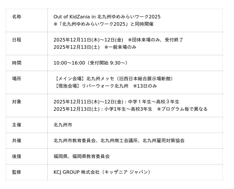 北九州市では、こどもの職業・社会体験施設「キッザニア」の企画・運営を行うKCJ GROUP 株式会社による監修のもと、小学生から高校生を対象に、キッザニアの街を飛び出して実社会の仕事を体験できるプログラム「Out of KidZania in 北九州ゆめみらいワーク2025(以下 本イベント)」を開催いたします。