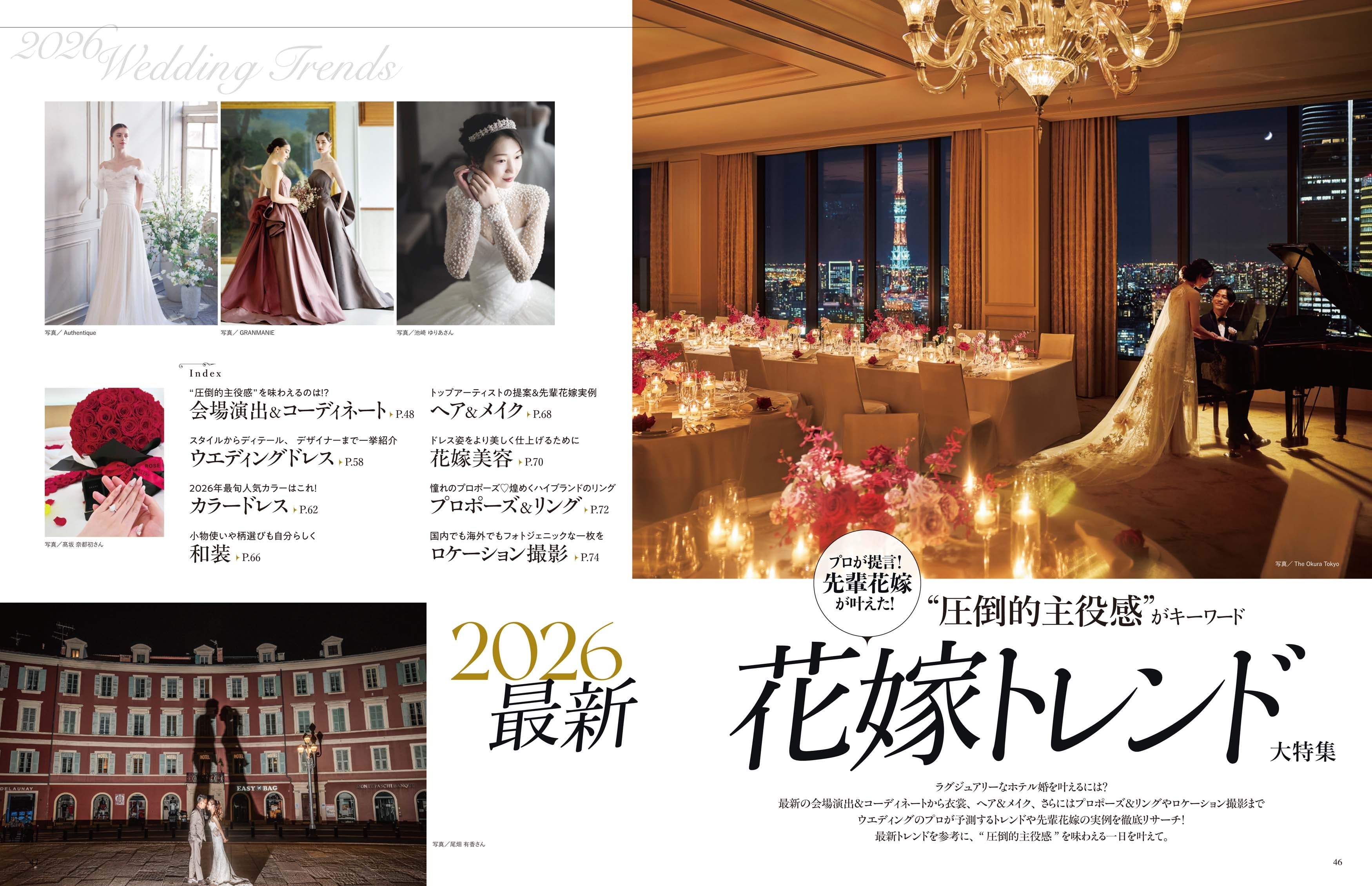 大特集は、2026年ウエディングの最新トレンドスタイルを大予想!素敵が詰まった「ホテル婚」のキーワードは“圧倒的主役感”。「会場演出&コーディネート」「ウエディングドレス」「カラードレス」「和装」「ヘア&メイク」「花嫁美容」「プロポーズ&リング」「ロケーション撮影」について、ウエディングのプロが予想するトレンドや先輩花嫁たちの実例を徹底リサーチしました!