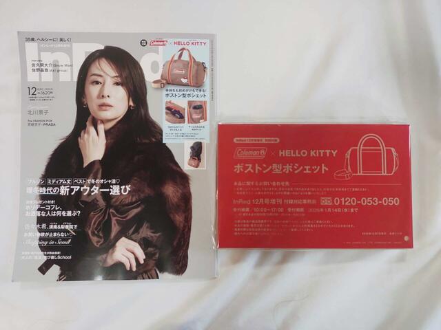 11月7日に発売された雑誌『InRed』12月号増刊の付録は、Coleman×ハローキティのコラボバッグ(ボストン型ポシェット)です。