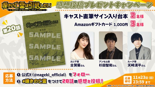 第20話の放送を記念して、杉田智和さん (アンセム・スマート役) 、天崎滉平さん(ルーク・サイコル役)、古賀葵さん(ルシア・ロジェ役)の直筆サイン入り台本やAmazonギフトカード1,000円分が当たるキャンペーンを開催します。