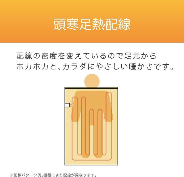 配線密度をエリアごとに調整した頭寒足熱配線が特長。足元を重点的に温めつつ、頭側は穏やかな温度に保つため、寝つきやすく、体への負担を低減します。布団の下からの冷えを遮断し、中央表面温度(強)約53°Cまでしっかり温める設計は、冬場の底冷え対策にピッタリ。