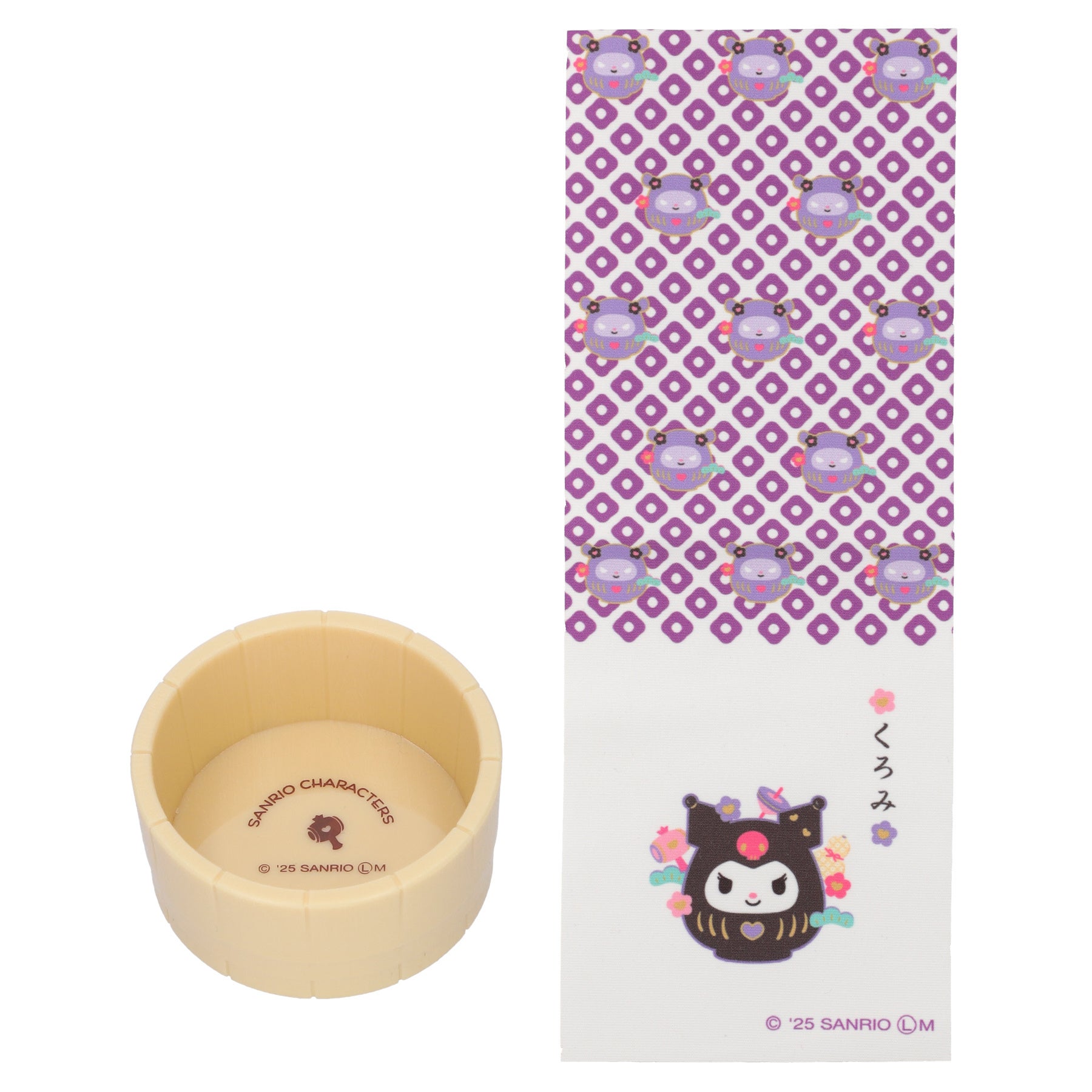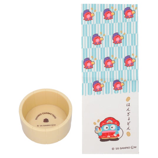 ミニチュアの手ぬぐいと湯おけをセットにしたアイテムです。手ぬぐいは桔梗麻の葉や矢絣の柄の生地に、だるまのような姿の「クロミ」とお友だちの“バク”、大黒天に扮した「ハンギョドン」と“さゆり”など、ユニークなデザインを採用しています。手のひらサイズの湯おけの底面には、それぞれの手ぬぐいデザインをイメージしたアイコンがあり、手ぬぐいの巻紙にもアイコンをプリントした統一感のあるアイテムに仕上げました。