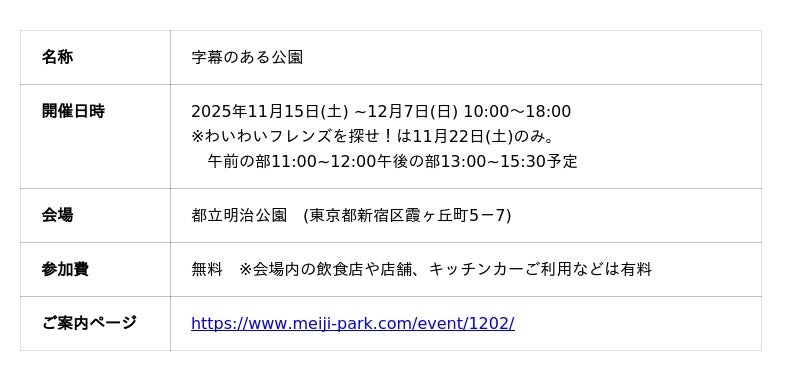 1日限定で都立明治公園に『世界に字幕を添える展in東京』を応援する「わいわいフレンズ」たちが登場。当日は「わいわいフレンズ」として、ろうインフルエンサーの吉田まりさん、インフルエンサーの難聴うさぎさん、手話を伝える姉妹ユニットのLand Heyさんが参加予定です。フレンズを探して声を掛け、条件をクリアすると限定グッズや都立明治公園で使えるお得なチケットなどがもらえるスペシャルイベントにぜひご参加ください。聞こえ方や言語の違う人同士が楽しみながらコミュニケーションできる機会作りにつなげます。