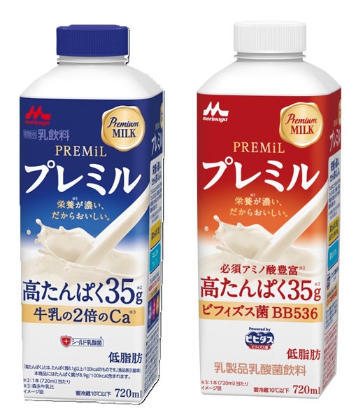 「プレミル」(青パッケージ)は、牛乳の2倍のカルシウム(当社商品「森永牛乳」比)を配合し、たんぱく質と一緒に効率よくカルシウムも摂取できます。また、当社の独自の機能性素材で健康力をサポートする『シールド乳酸菌(R)』を配合しています。