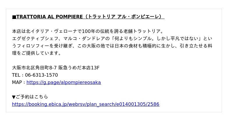 阪急うめだ本店13階「TRATTORIA AL POMPIERE(トラットリア アル・ポンピエーレ)」では、クリスマス限定スペシャルコースのご予約を受付開始。