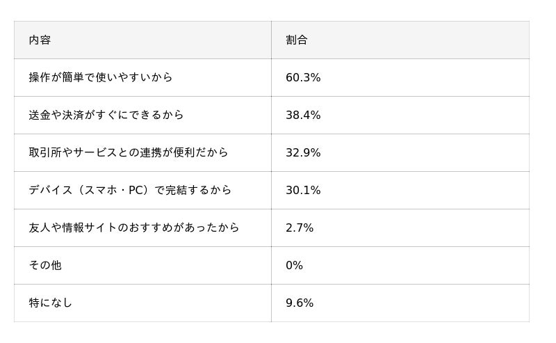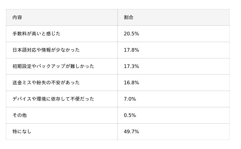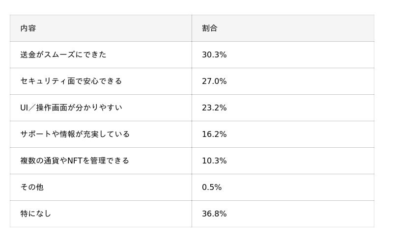 ・ウォレットを使って「良かった」と感じた点では、「送金がスムーズにできた」(30.3%)が最多。反対に「手数料が高い」(20.5%)、「日本語対応や情報が少ない」(17.8%)といった不満も見られ、利便性と安全性のバランスが今後の課題として発見された。