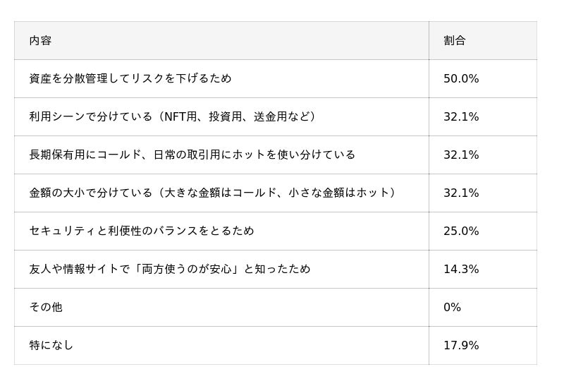 ・ホットウォレットのタイプは「モバイルウォレット(スマホアプリ型)」(55.5%)が中心で、利用理由として「操作が簡単で使いやすい」(60.3%)が最も多く挙げられた。一方、コールドウォレットを選んだ理由では「セキュリティ面で安心できる」(64.0%)がトップとなった。