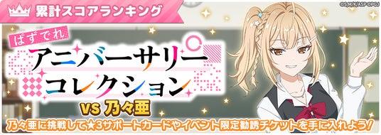 11月14日(金)よりイベント「ぱずでれアニバーサリーコレクションVS乃々亜」を開催します。当イベントでは、期間中の累計スコア順位に応じたランキング報酬が獲得可能です。またイベントステージで集めたポイントで、イベント限定のサポートカードやアイテムが獲得できる「ポイント交換所」も登場。繰り返し挑戦してよりたくさんのポイントを集め☆3サポートカードや勧誘チケットを手に入れよう!