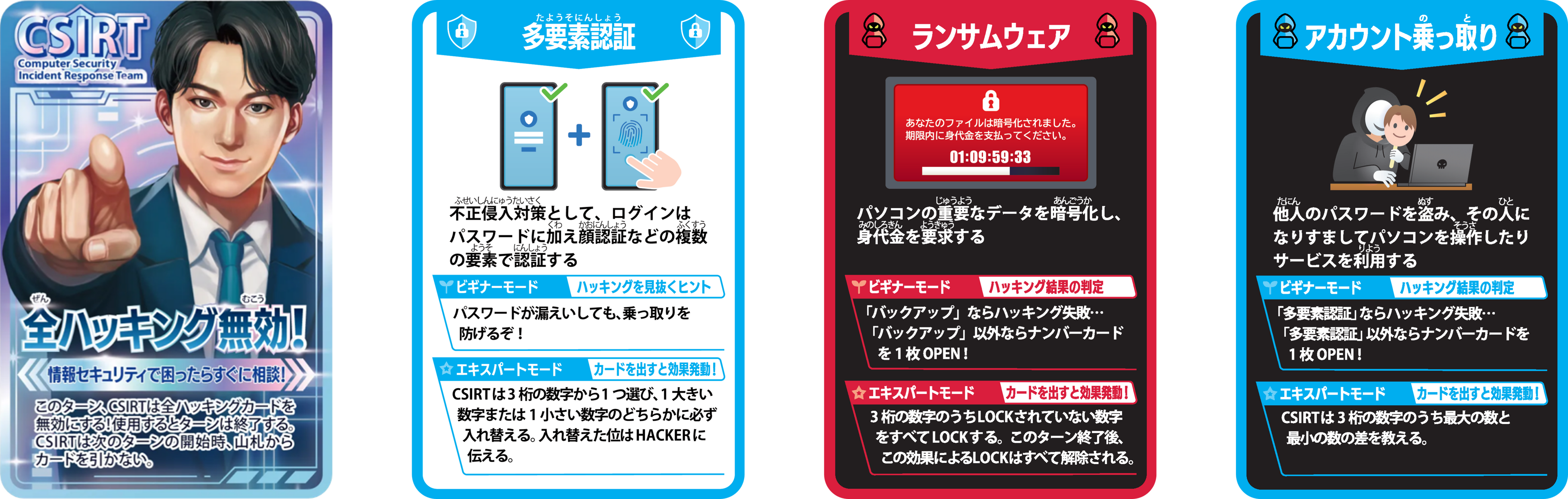 本カードゲームは、プレイヤーのレベルに応じて、セキュリティに詳しくない方も遊びやすい「ビギナールール」と、駆け引きや戦略性を楽しめる「エキスパートルール」の2種を用意。プレイヤーはそれぞれの立場から手札を駆使して心理戦を繰り広げる中で、自然とセキュリティ知識を身につけることができます。
