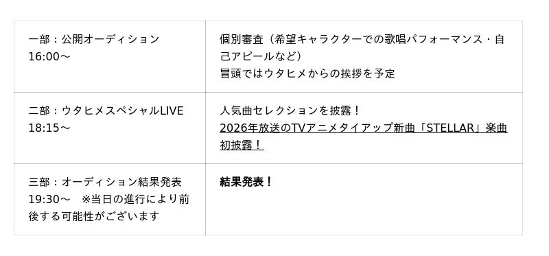 当日は決勝まで勝ち残った応募者たちの審査を公開。ウタヒメドリームオールスターズ全員出演スペシャルLIVEも開催し、最後に結果発表の模様もご覧いただける三部構成のイベントです。
