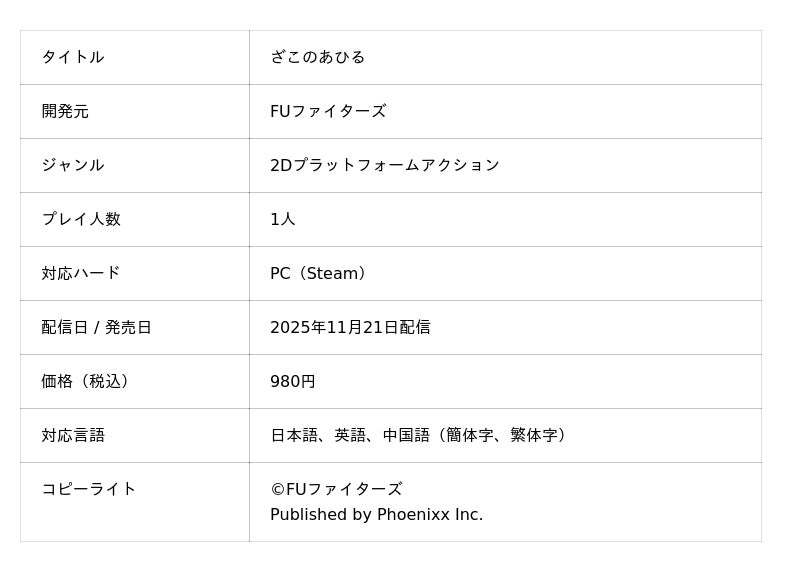 株式会社Phoenixx(フィーニックス)(東京都武蔵野市、代表取締役社長:坂本 和則)は、高難易度登山アクション『ざこのあひる』を、2025年11月21日(金)にSteamにて配信することを決定いたしました。