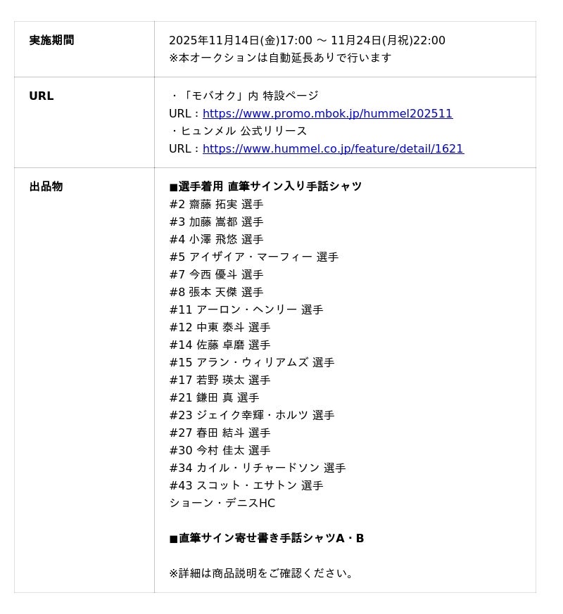 株式会社モバオク(本社:東京都渋谷区、代表取締役社長:小一原 宏樹、以下モバオク)が運営するオークションサービス「モバオク」にて、株式会社エスエスケイが実施する「名古屋ダイヤモンドドルフィンズ×ヒュンメル 手話シャツ チャリティーオークション」を、2025年11月14日(金)から開始いたします。