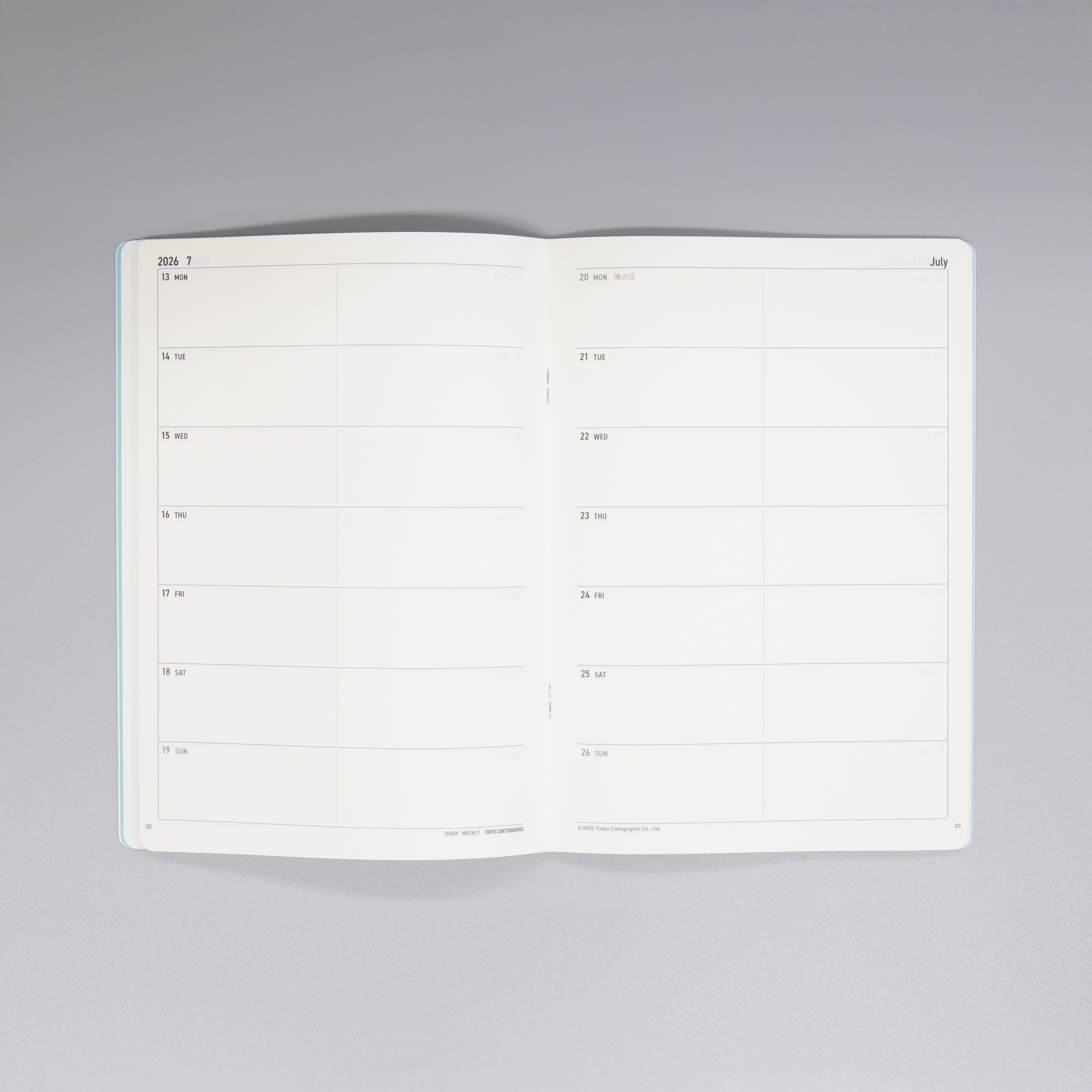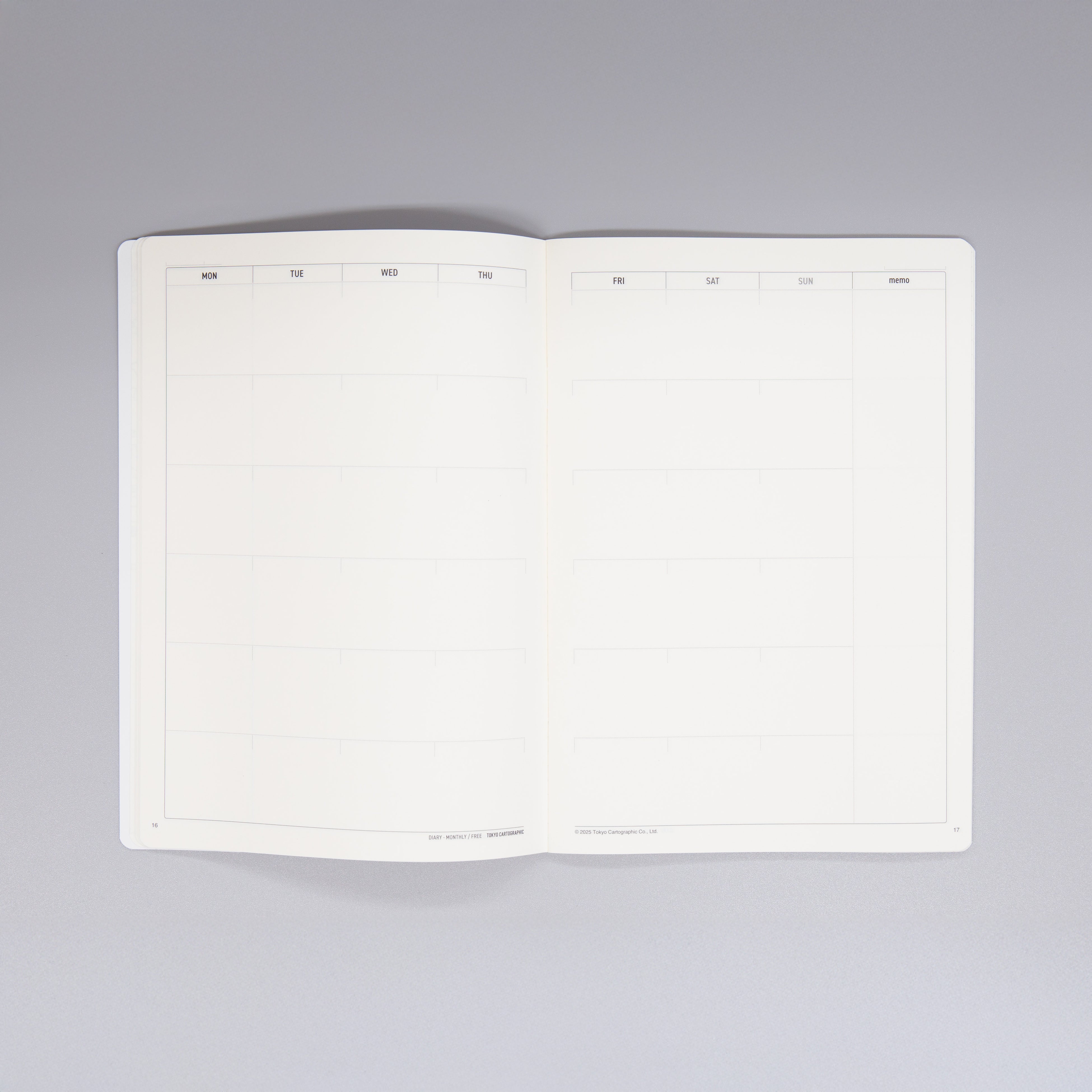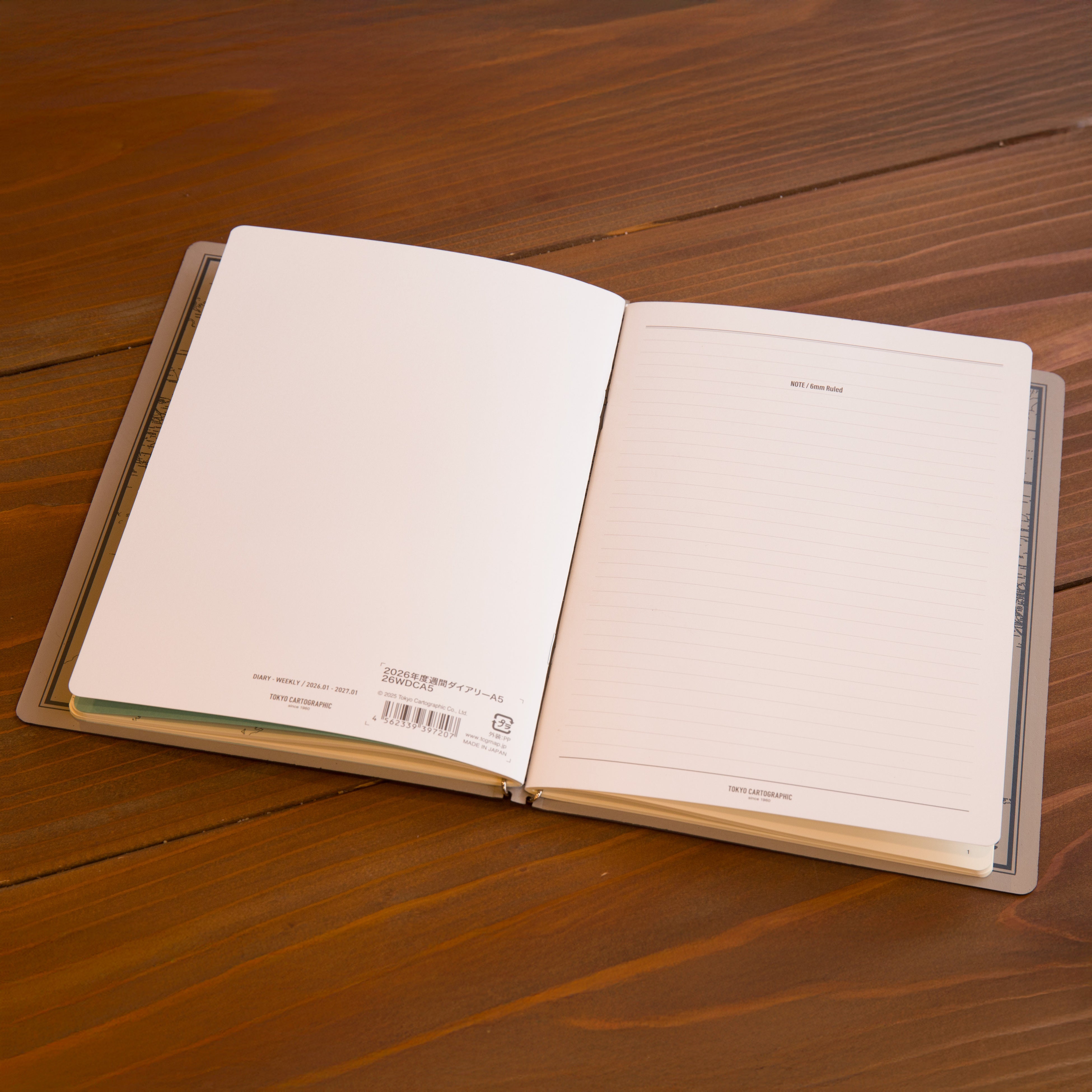 背表紙にはフックバーの間から見える「TOKYO CARTOGRAPHIC」ロゴがさりげなく空押し処理されています。